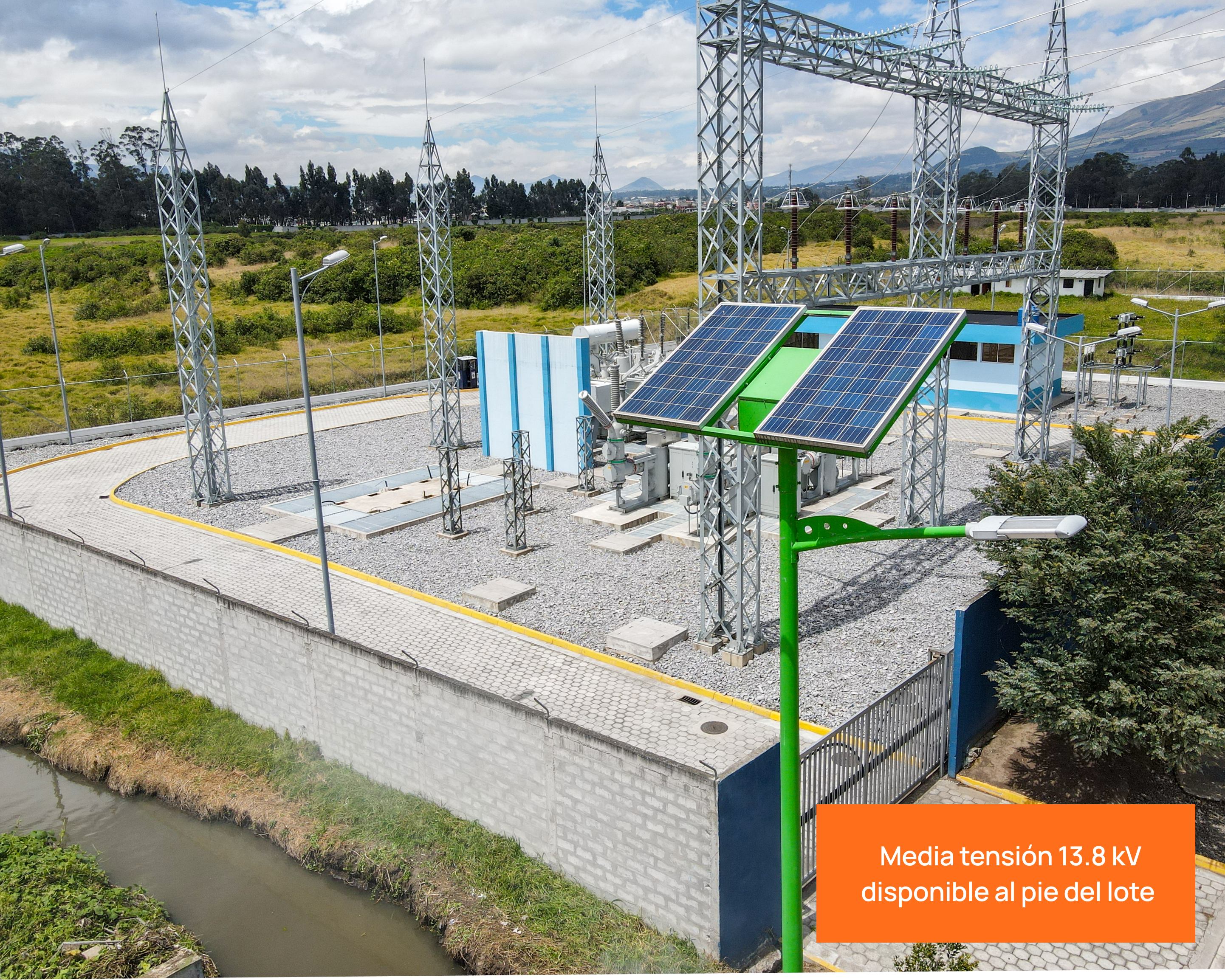 • SISTEMA FOTOVOLTAICO DE ILUMINACIÓN VIAL potenciado por paneles solares. En total, hay 120 luminarias distribuidas a lo largo de los 4 km de vías internas.